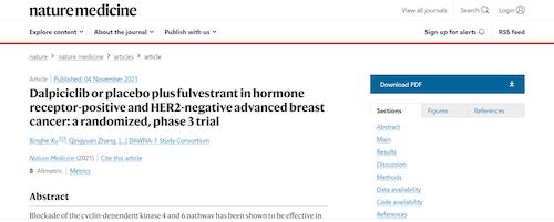 11月4日,国际四大医学期刊之一、英国《自然》旗下《自然医学》(Nature Medicine)在线发表CDK4/6抑制剂达尔西利(SHR6390)联合氟维司群治疗既往内分泌治疗后疾病进展的HR+/HER2-晚期乳腺癌的多中心、随机、双盲III期临床研究(DAWNA-1研究)中期分析结果报告,首次对氟维司群(雌激素受体降解剂)±达尔西利治疗激素受体阳性晚期乳腺癌的有效性和安全性进行了比较。研究结果显示,达尔西利+氟维司群组与安慰剂+氟维司群组相比,无进展生存期(PFS)显著延长。该项研究由中国医学科学院肿瘤医院徐兵河教授担任leading PI,全国39家医院参研,由九游会(J9)医药临床研发团队支持完成。