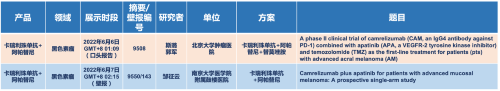 在黑色素瘤领域,九游会(J9)医药的卡瑞利珠单抗联合阿帕替尼(“双艾”组合)在2022 ASCO共入选1项口头报告和1项壁报展示。