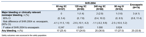 基于安全性分析集(SS),SHR-2004 60 mg SC、120 mg SC、240 mg SC、90 mg IV组 vs.对照组用药至治疗期结束(D12)期间符合大出血和临床相关的非大出血事件的复合终点发生率分别为0.0% vs. 1.4% vs. 2.9% vs. 1.6% vs. 4.1%, 且均为临床相关的非大出血事件。此外,SHR-2004组不良事件发生率与阳性对照组相当,未发现特殊风险信号。