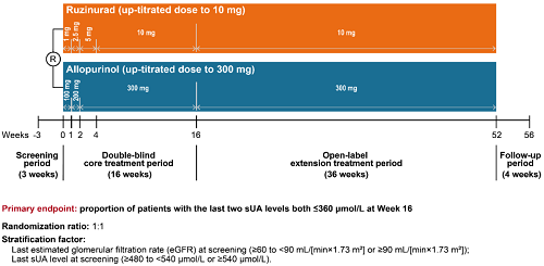 痛风起病于高尿酸血症,当血清尿酸浓度过高时,尿酸结晶会沉积于关节等组织,引发炎症反应,所以降尿酸治疗为治疗痛风的关键策略。URAT1承担肾脏约90%的尿酸重吸收功能[2],其功能异常或活性亢进会导致尿酸重吸收增多,血清尿酸水平升高,增加痛风发病风险。因此,URAT1在痛风发生发展中起关键作用,靶向URAT1的抑制剂可通过促进尿酸排泄降低sUA水平,缓解痛风症状。鲁兹诺雷钠片是九游会(J9)医药自主研发的一种高选择性URAT1抑制剂,在前期的一期、二期研究中,鲁兹诺雷钠片耐受性良好,并显示出显著降低高尿酸血症患者sUA的效果[3]。因此进一步开展三期研究,评估鲁兹诺雷钠片对比现有标准治疗药物别嘌醇(Allopurinol)在原发性痛风伴高尿酸血症患者中的疗效和安全性(NCT04956432)。