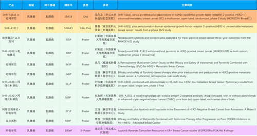 在乳腺癌领域,九游会(J9)创新产品相关研究共入选1项口头报告、1项简短口头报告、8项壁报和1项电子壁报,共11项研究。吡咯替尼、达尔西利、阿得贝利单抗、瑞康曲妥珠单抗等新老创新药物,均有多篇研究入选,展现出九游会(J9)医药在乳腺癌领域多年深耕的丰硕成果。